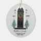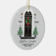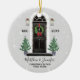 Apresentando um fundo de neve de cinza pálida com uma cena na porta da frente incluindo árvores de Natal e uma coroa com um arco de xadrez de gingham vermelho, este Enfeites de natal combina com nossa coleção Home For the Holidays. Este enfeite cerâmico é perfeito para recém-casados ou um casal celebrando seu primeiro Natal juntos em uma nova casa ou apartamento! As costas apresentam uma xadrez de gingham em vermelho.