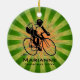 Ornamento Ciclista Natal 20XX. Ciclista feminina contra um fundo verde e laranja de estouro. Todo texto personalizável, frente e verso!