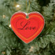 O lado frontal do ornamento em forma de coração mostra um coração vermelho "geleificado" (brilhante e tridimensional) com um coração vermelho com estrutura de arame no centro. No centro do coração menor está a palavra "Amor" na escrita. Do lado oposto, personalize com nomes em escrituras negras, sobre o coração "geleia".