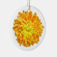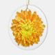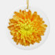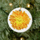 Ornamento redondo com a foto de um crisântemo vermelho, alaranjado e amarelo.