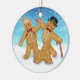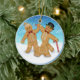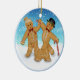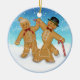 Trio divertido apresenta um ornamento redondo com uma garota de pão de gengibre, um menino e um cão de gengibre em uma coleira. O fundo é uma cena de inverno com neve coberta de chão e flocos de neve. Outra versão disponível com texto e data personalizáveis.