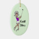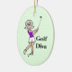 Um enfeite tão divertido para dar à mulher golfista que você conhece nas férias como um lembrete anual para sua árvore todo ano de seu amor, amizade ou gentileza. As palavras "Golf Diva" na frente podem ser removidas. No verso personalize isso com seu nome e ano. Ou coloque o que quiser nas costas. Devido ao estilo design, você só pode comprar isso em ornamentos OVAL. Desenhado por Sheila Cicchi, Brownielocks.com. Todos os Direitos Reservados.