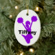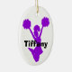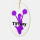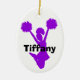 Silhueta roxa de um cheerleader de salto contra um ornamento cerâmico oval branco. O texto feito sob encomenda corajoso preto lê o cheerleader, na parte traseira, e o nome, na parte dianteira. Personalize todo o texto para seu líder especial do espírito. Faz uma grande ideia do presente.