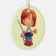 Um ornamento tomado partido dobro que caracteriza uma menina bonito dos desenhos animados com cabelo vermelho, sentando-se sobre um carretel gigante do algodão cor-de-rosa, guardarando uma agulha e um botão amarelo com 4 furos.