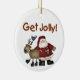 O ornamento de guardas de Férias, com Papais noeis e uma das renas, e texto que diz "Get Jolly!".