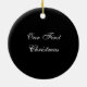 Ornamento com uma cor damasco preta na parte dianteira com sala adicionar um nome e uma data. A parte traseira é th preto dos wi as palavras "nosso primeiro Natal", que pode igualmente ser mudado para adicionar sua própria personalização.