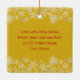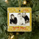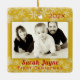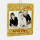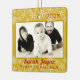 A primeira foto de Natal foi guardada. Ornamento de árvore quadrado, de lado duplo, em amarelo ouro com texto vermelho. O modelo de foto é horizontal com uma borda dourada. Data do ano no topo, com nome e texto de "primeiro Natal" embaixo da foto. No verso, mais texto pode ser adicionado. Um exemplo poderia ser o endereço residencial onde a criança viveu pela primeira vez, ou dizer "Feliz Natal" para fazer dele um enfeite para os avós ou parentes.