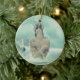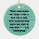 Ornamento redondo com a imagem de uma sereia no mar na frente e uma linha de um poema por, por exemplo, cummings no verso.