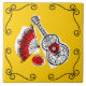 Design de Whimsical desenhado em estilo retrô, com lembranças de um feriado espanhol; uma guitarra de ferro em formas brutas, um fã de legado e uma rosa vermelha. Um design personalizável em preto, branco, vermelho e ouro amarelo para você personalizar com seu próprio texto, imagens e ideias. Uma imagem de arte digital original.