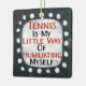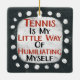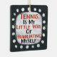 Um design tipográfico irreverente que diz "Tênis é minha pequena maneira de me humilhar". Ele apresenta texto preto e vermelho em um retângulo branco com pontos brancos engraçados e lúcidos ao seu redor, todos em um fundo de cinza escura.