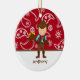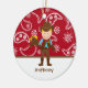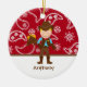 Esta é uma lembrança adorável. É um ornamento com um impressão ocidental vermelho na parte superior e a parte inferior é branca com uma tira marrom ao longo dela. No meio é um vaqueiro que veste botas e veste de vaqueiro com uma camisa azul. Tem um vaqueiro marrom ha sobre demasiado. Está guardarando um cavalo em uma vara em sua mão. ©babystar