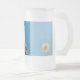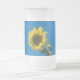 Grande girassol amarelo contra o brilhante céu azul, flanqueado por painéis opacos menores de girassóis solteiros.