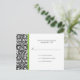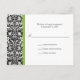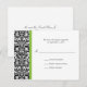 Um padrão de wallpaper damask preto-e-branco com sotaques de verde limão destaca esta placa de resposta clássica. Facilmente personalizado com suas próprias informações. Certifique-se de alterar seu endereço de devolução na parte traseira. Disponível em cores alternativas com cartões de salvamento, convites, cartões de recepção e favores correspondentes.