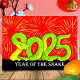 Este cartão desenhado com a mão apresenta um cobra verde se retorcendo no formato 2025. Atrás dele os fogos de artifício explodem em frente a um fundo vermelho. Abaixo encontram-se as palavras "Ano do cobra" escritas em branco sobre fundo preto. O estilo é um desenho animado.