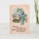 Esta imagem cristã do cartão da páscoa do vintage que mostra uma cruz feita de flores azuis com uma fazenda bonita na primavera no fundo. As palavras, "aumentou! Exulte! Exulte!" esteja no interior.