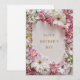 Um lindo cartão do Dia das Mães com uma bouquet de flores rosa e branca sobre um fundo branco. O texto na frente do cartão diz "FELIZ DIA DAS MÃES" em uma fonte rosa.