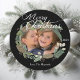Um cartão com fotos de Natal redondo com um verde e uma coroa de pinhinhos, uma área que você pode adicionar facilmente uma foto, um texto branco que leia Feliz Natal, e uma área que você pode adicionar seu nome e ano atual na frente. A parte traseira da placa é preta com texto branco rico que lê Felizes Feriados com flocos de neve casal. Fotografia © Storytree Studios, Stanford, CA