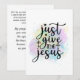 A placa de saudação plana de scripture aspas inspiracional mostra um plano de fundo simples de abstrato com cores pastel de pincéis azuis, lavandas e amarelos em um plano de fundo branco. Ele mostra o título de uma canção de Culto cristã, "Apenas me dê Jesus." A Bíblia Verso 2 Corintianos 3:18, "Mas todos nós aprisionamos a glória do Senhor com rosto aberto, são transformados na mesma imagem da glória para a glória, como pelo Espírito do Senhor." O verso traseiro e a oração de saudação podem ser personalizados ou excluídos para uma nota manuscrita.