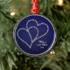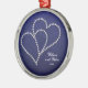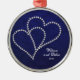 Dois corações feitos do cristal de rocha bling do estilo - diamantes que conectam e que ligam-se sobre se em um fundo profundo dos azuis marinhos com uma cor damasco subtil nela. Excelente para casamentos, aniversário, noivado, celebração do amor, romance, casais. Pendure de sua árvore de Natal todos os anos em honra do ano dado ou comemorado. Mude o texto para serir-me aqui ou enviar por correio electrónico se você precisa a assistência com personalização ou a imagem colocada em outros produtos de Zazzle em minha loja. Se eu posso… eu vou faz4e-lo! ~:)