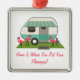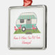 Um ornamento que caracteriza uma ilustração de uma casa retro do reboque com listra de turquesa e toldo e três flamingos plásticos cor-de-rosa na jarda. O texto customizável diz que "Home é onde você pôr seus flamingos!"