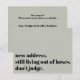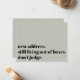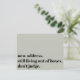 Neste cartão irônico, uma fonte ousada foi usada para renderizar "novo endereço. ainda vivendo de caixas. não julgue." na frente. Detalhes atualizados, juntamente com um amigável "Keep in Touch!" aparecem no verso. Todas as fontes, cores e texto podem ser alterados de acordo com suas próprias necessidades.