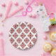Prato redondo com fundo branco, apresentando um padrão ornamental vermelho repetitivo. O design se assemelha a floreios abstratos e simétricos. O tom é elegante e clássico.