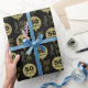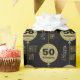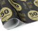 Balões de brilho simulados Dourados com cordas fazem um padrão contínuo a partir dos 50 anos de idade e do nome da pessoa de aniversário. "Parabéns" abraça a corda do balão num fundo preto. O papel de embrulho perfeito para qualquer glamouroso de 50 anos.