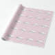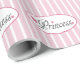 Este papel de envolvimento caracteriza a princesa da palavra com corações cor-de-rosa e o grupo em um fundo listrado cor-de-rosa e branco.