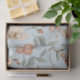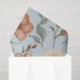 Para os presentes mais bonitos, um vintage inspirou um papel de tecido de florais em cor-de-rosa e creme, sobre fundo azul em pó.