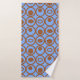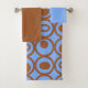 Este conjunto de toalhas tem um pano de lavagem azul claro, uma toalha marrom da mão e uma toalha de banho com um design geométrico de círculos em filas com círculos ou ovais dentro em castanho num campo azul.