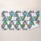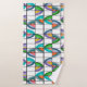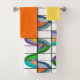 Este conjunto de toalhas tem um pano de lavagem amarelo, uma toalha de mão laranja, e uma toalha de banho com um design de flores de dentro ovais que foram divididos em quartos e colocados numa grelha.