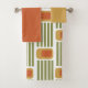Este conjunto de toalhas tem um pano de lavagem amarelo, uma toalha de mão laranja, e uma toalha de banho com um design moderno do século médio feito de cinco linhas verdes e um retângulo dourado arredondado com um retângulo laranja arredondado repetido na design.