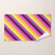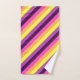 Um conjunto de toalhas de banho com um design de padrão bonito e colorido de faixas diagonais em plum roxo, lavanda, amarelo-limão, laranja-melão e magenta brilhante.