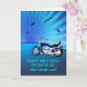 Feliz cartão de aniversário com uma moto. Envie um cartão de um grupo de amigos ou colegas. Uma carta perfeita para um motociclista. Uma moto azul com um pôr do sol estilizado e pássaros voadores. Qualquer entusiasta de bicicleta vai adorar ter uma carta como esta.