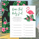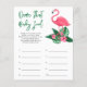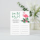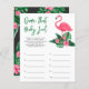 O design de convite para chá de fraldas apresenta flamingo cor-de-rosa com frondes verdes de palma e flores de hibisco tropicais. "Aloha Baby". Um padrão floral tropical com cor preta de fundo se veste na parte de trás do cartão.
