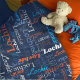 Médio de texto de nome curto tipográfico azul, cinza, azul ciano, laranja e branco em um design de cobertor personalizado de fundo azul escuro. A cor de fundo pode ser alterada se necessário. Texto gráfico personalizado divertido cobertor personalizado. Ideal para o carro, acampando para as noites de inverno ou para sair. Personalize com seu próprio nome abreviado, lê atualmente Lochie para obter ajuda com a personalização e outras extensões de nome, entre em contato comigo. © Art e design por Sarah Trett para www.mylittleeden.com