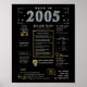 Tome uma jornada de volta a 2005 com nosso cativante poster de aniversário digital, repleta de fatos históricos, eventos significativos e narrativas cativantes do passado. Adorado com ouro elegante e sotaque prateado contra um pano de fundo preto impressionante, este poster de aniversário irradia o charme do eterno. Nosso poster de aniversário oferece uma espiada intrigante em 2005, mergulhando em aspectos como renda média, invenções notáveis, ocorrências significativas, tendências da moda e expressões coloquiais da época. Destaca momentos-chave como o advento das plataformas de mídia social, a onda de TV real e o surgimento de serviços de transmissão contínua. Invenções como smartphones, telefones com câmera e carros híbridos ganham palco central, refletindo os notáveis avanços tecnológicos da era. No geral, o poster capta a essência da vida nos anos 2000, encapotando tanto a inovação tecnológica quanto os fenômenos culturais como a música e a moda. Serve como um começo de conversa cativante em comemorações de aniversário e aniversários, e quando elegantemente enquadrado, evolui para uma lembrança apreciada, preservando o espírito dos tempos para as gerações vindouras.