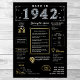 Volte para 1942 com nosso poster digital cativante, cheio de tidbits históricos, eventos notáveis e histórias intrigantes de ontem. Apresentando elegantes toques de ouro e prata colocados sobre um fundo preto em negrito, adornados com símbolos únicos e texto de na moda, este poster exude o charme clássico. Quer esteja provocando conversas em encontros ou simplesmente exibido como uma merecedora apreciada, isso traz uma vibração nostálgica a qualquer espaço. A poster mostra um retrato de 1942, cobrindo aspectos como renda média, invenções populares, momentos históricos-chave, tendências da moda e gíria do tempo. Destaca marcos significativos como a reconstrução da guerra poste, a ascensão da música balançante e a produção em massa de pastilha elástica. Invenções notáveis como forno de micro-ondas, motor a jato e microscópio eletrônico também são apresentadas, oferecendo uma visão dos avanços tecnológicos da era. No geral, o diagrama captura a essência da vida na década de 1940, tocando em tecnologia, custos de vida e fenômenos culturais como música em movimento e moda em tempo de guerra.