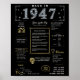 Volte para 1947 com nosso poster digital cativante, cheio de tidbits históricos, eventos notáveis e histórias intrigantes de ontem. Apresentando elegantes toques de ouro e prata colocados sobre um fundo preto em negrito, adornados com símbolos únicos e texto de na moda, este poster exude o charme clássico. Quer esteja provocando conversas em encontros ou simplesmente exibido como uma merecedora apreciada, isso traz uma vibração nostálgica a qualquer espaço. A poster mostra um retrato de 1947, cobrindo aspectos como renda média, invenções populares, momentos históricos-chave, tendências da moda e gíria do tempo. Destaca marcos significativos como a reconstrução da guerra poste, a ascensão da música balançante e a produção em massa de pastilha elástica. Invenções notáveis como forno de micro-ondas, motor a jato e microscópio eletrônico também são apresentadas, oferecendo uma visão dos avanços tecnológicos da era. No geral, o diagrama captura a essência da vida na década de 1940, tocando em tecnologia, custos de vida e fenômenos culturais como música em movimento e moda em tempo de guerra.