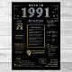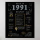 Passo a 1991 com a nossa cativante poster de aniversário digital, repleta de fatos históricos, eventos significativos e narrativas mesmerizantes do passado. Adorado com ouro elegante e sotaques prateados contra um pano de fundo preto em greve, este poster de aniversário emana charme de eterno. O nosso poster de aniversário oferece uma visão intrigante de 1991, mergulhando em aspectos como renda média, invenções notáveis, ocorrências significativas, tendências da moda e expressões coloquiais da época. Ela acende momentos-chave como a bolha Dot-Com, a ascensão de bandas de garotos, o advento da Internet discada, e o pânico Y2K. Invenções notáveis como a World Wide Web, mensagens de texto, MP3 e a câmera digital são destacadas, refletindo os notáveis avanços tecnológicos da era. Ao todo, o poster de aniversário capta a essência da vida nos anos 1991, encapotando tanto a inovação tecnológica quanto os fenômenos culturais como a música e a moda. Serve como um começo de conversa cativante em comemorações de aniversário e aniversários, e quando elegantemente enquadrado, evolui para uma lembrança apreciada, preservando o espírito dos tempos para as gerações vindouras.