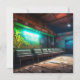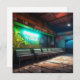 Postar prédio apocalíptico abandonado com grafite verde e fileira de assentos vazios. Decaimento urbano, espaços perdidos, arte aérea.