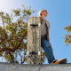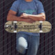 textura de madeira desgastada e um rosto de cachorro divertido. Um deck de skate com estilo vibe de verão que é ao mesmo tempo chique e divertido.