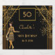 Ouro falso elegante e etiqueta glamourosa preta para uma festa de aniversário 50ª (ou qualquer idade) do retrô de 1920! Decorado com uma garota de flapper estilo 1920, padrão de estilo art deco e fogos de artifício. Personalize e adicione 50 anos, um nome e uma data. Texto do ouro.