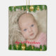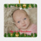 Crie esta decoração personalizada da árvore de Natal para o primeiro Natal daquele especial. Mantenha-o como guardião durante anos. Foto do bebê na frente com árvore de abetos e decoração bálspera no topo e no fundo. No fundo você pode preencher o nome e o ano do seu filho.