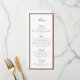 Elegant wedding menu card featuring a refined deep red border and classic script typography. The clean layout and rich red frame create a timeless presentation ideal for formal wedding receptions and sophisticated table settings.