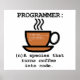 Uma pequena piada sobre a definição de programador de computador: "programador é uma espécie que transforma café em código". Simples, mas acerte a marca. Além da coleção pessoal, você pode usar este poster como um presente especial para seus amigos geeks: funcionarios de TI, suporte técnico, ou apenas alguém ao seu redor que não pode desviar seus olhos do monitor LCD o dia inteiro, a noite inteira, acompanhado de um novo pote de café.