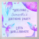 Shellebrate de vamos! Poster de boas-vindas do Mermaid Party com caudas mágicas de sereia e tipografia decorativa. O ditado divertido diz "Bem-vindo à Festa de aniversário de [Nome]... Shellebrate de vamos!" que você pode personalizar. Este brilhante design vibrante apresenta caldas de sereia e bolhas do oceano em tons de aquarela de verde roxo rosa e azul turquesa. Fácil de personalizar e perfeito para festas de sereia, festas de piscina, princesa feminina e temas do mar.