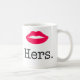 Uma caneca de café engraçada que caracteriza a palavra "dela" em um grupo de lábios cor-de-rosa brilhantes acima dele.
