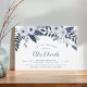 O convite para chás de fraldas chic apresenta uma borda superior de flores e botânicos em cascata em tons de azul inspirados na cerâmica holandesa delft. Personalize com os detalhes do seu chá de fraldas em marinho azul, com o nome da mãe a ser em um elegante roteiro de caligrafia estilo, escrito à mão.