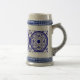 Um design original, azul e branco, com círculos preenchidos com flores e folhas rolantes.